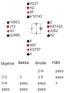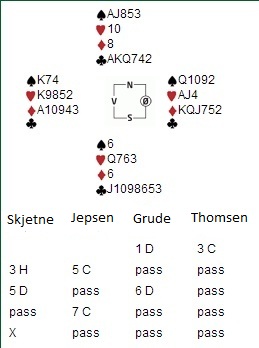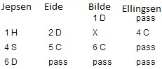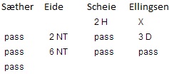 Eide decided to bid 6 NT after Ellingsens 3 diamond. Looks like there was a misunderstanding with the 3 diamond bid. 6 NT was unmakeable and Norway U-20 took the lead by by 14 IMPs when Skjetne-grude played 4 hearts doubled 4 down.