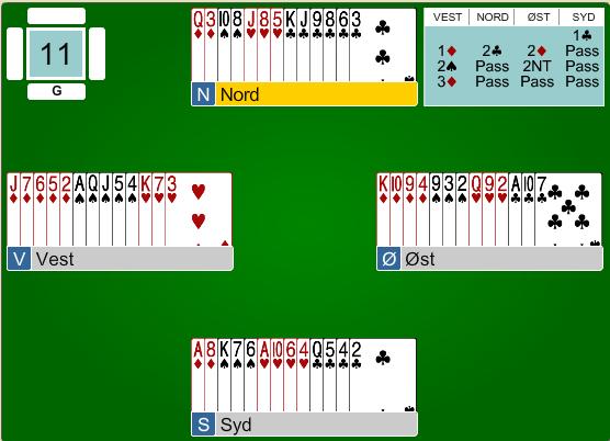 Olav forteller at etter han fornøyd hadde meldt en ruter så "forsvant" det en kløver og dukka opp en "spar" til.... Dermed ble 2 spar i neste melderunde tolket av makkeren som minst 4 ruter og 4 spar, hvorpå 2NT meldes. Det er jo ikke urimelig og viser vel omtrent en slik hand. På 3 ruter går det imidlertid pass rundt.... I ettertid lurer Olav på hvordan finne optimalkontrakten 4 spar. Det er flere mulige måter å gjøre det på, men den mest tradisjonelle vil vel være å melde inn 1 spar hvorpå makker har til 2 spar (6-9 og trekortsstøtte) over 2 kløver. Når det nå meldes 3 ruter etter at makker har støttet i spar, så vokser kortene og øst bør ta imot invitten og avslutte med 4 spar. Men - dette må man selvfølgelig ha avtaler på.