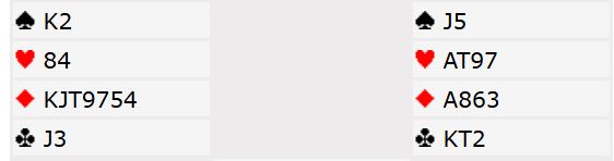 3NT kunne blitt vunnet ved å stikke hjerterutspillet og spille ruter til bordet fulgt av kløver mot øst og tippe rett, eller spar til kongen i andre stikk. Men det er å lukke igjen øynene og satse alt for å vinne kontrakten. Det kunne jo vært annerledes sits i de sorte fargene. Lukker du igjen øynene og satser alt og det går det galt kan noen ganger motspillerne få fem (kanskje seks) sparstikk, to hjerterstikk og to kløverstikk, dvs. fem sonebet og en nitrtist -500! Så det tryggeste er vel å ta sine stikk, for -100 er kanskje ikke så dårlig? For se på N/S sine kort. Det står i 3 spar (+140) og det ble også +620 i 4 spar ved en ved del bord samt flere bord hvor N/S noterte +100 eller +200 i motspill mot 5 ruter. Så å gå en bet i 3NT ga omtrent middels i stedet for å risikere -500 som ville gitt -11 IMP.