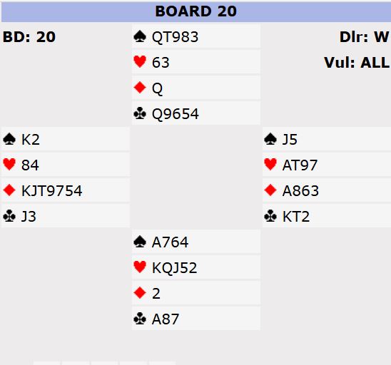 Vest hadde åpnet med 3 ruter og øst meldte 3NT som ikke akkurat er opplagt, men vel var ment som en stamp for å forstyrre N/S. Om 3NT hadde blitt doblet ville nok øst plukket ut i 4 ruter. Turneringsformen var i dette tilfellet IMP-par.