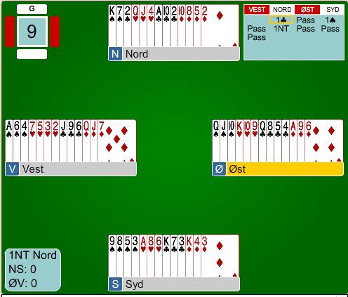 Så kom hjerter D som øst dekte med K og esset i bordet. Da la Tommy hjerter 3. Ny hjerter fra bordet fulgte Tommy med hjerter 2, J hos spillefører og siste hjerter fra gunnar. Nå spilte Rune hjerter 4, Gunnar saket kløver Q og Tommy hadde heldigvis ikke kastet hjerter 5 i vanvare tidligere i spillet.Det ble 7 stikk!