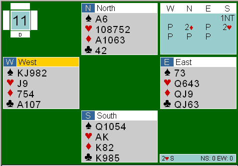 Syd åpnet med 1 NT, overføring til hjerter i Nord, slik at jeg i Syd ble spillefører i 2 hjerter..