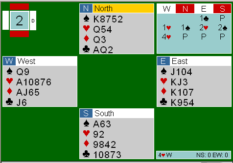 Støttedobling var visst ikke aktuelt .. Inge meldte 2 spar, og jeg dro til med 4 hjerter.. Det var siste spillet