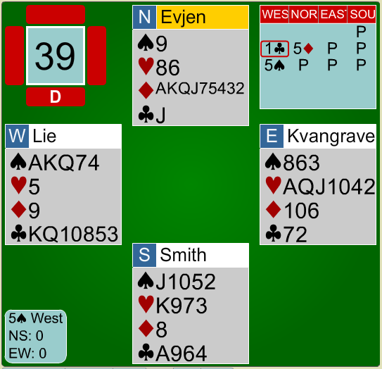 Sigurd Evjen startet med to ganger ruter og når syd saket på nummer to var det klart at det var fra 9-korts. Andre runde med ruter må vel kalles av det uheldige og passive slaget. Når så var gjort tok Terje muligheten. Han stjal hjemme, la ned Spar konge, før han fortsatte med kløver dame til knekt, liten og Ess. Vidar Smith kunne nå beseglet hele eventyret med å returnere en høy spar, en hjerter eller kløver 9. Da vil han sikre stikk for enten spar 10 eller kløver 9. Terje rekker ikke å kappe både kløver og spar, og han har kun ett inntak i bordet. Smith fortsatte med liten kløver og da var katastrofen et faktum. Den slapp Terje til bordets 7'er. Spar til 10 og dame, hjerter til Ess, og spar til ny kapp og claim! Elegant!