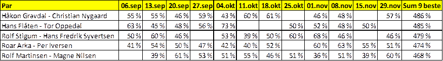 resultatene fra tirsdag finner du i fanen resultater, hyggelig at Randen og Teigen tok en tur innom. De kom og de vant. Garseg-Dybdahl tok sølv
