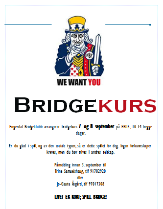 Engerdal BK holder bridgekurs med oppstart 7. og 8. september på EBUS, 10 til 14 begge dager. Vi inviterer også interesserte utenfor Engerdal til å delta! Vi arrangerer det som et oppstartskurs, så er det opp til klubbene å ta vare på sine kursister i fremtiden. Påmelding til Trine (91702920) eller Jo-Gaute (97017308) innen 3. september.