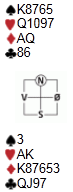 Jeg satt syd i dette spillet (spillet er vridd), og skulle få hjem 3NT etter at makker hadde vist hjerter og spar, mens jeg hadde meldt ruter. Ut kommer spardama, og du kan jo selv legge en liten plan før du går videre: