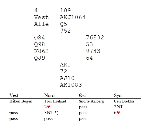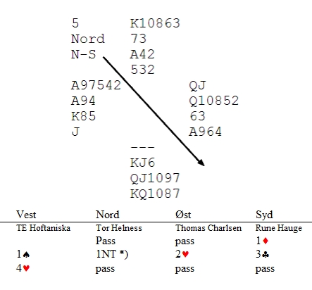 Når spillet var ferdig, kom det for en dag at Tor ikke hadde kløver, men hadde meldt 1NT naturlig. Da mente vest at  hvis han visste at det var sparhold bak han, ville han kun invitert til utgang, ikke hoppa til 4hj. Han sa også at makker ville ha passa invitten. Jeg tror ikke noen spurte hva Rune Hauge ville meldt over 3hj, men 4kl ser da ikke dumt ut? Står det ikke nesten 5kl i syd?