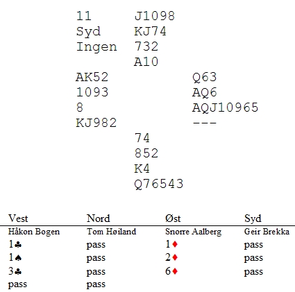 Nå skal jeg fortelle deg hvor nære jeg var til å vinne. Du ser at Geir i syd har hjerter åtte? Hvis jeg hadde hatt åtteren, ville 6ru stått. Hvis jeg hadde hatt syveren og Tom åtteren, ville det også stått. Det er små marginer vel?