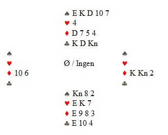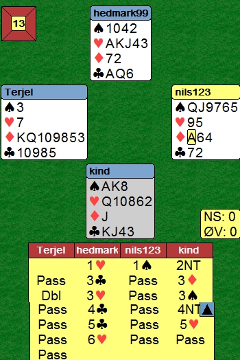 italia meldte lett 6sp på det samme spillet. Legg merke til 4ru som renonsvisende i hjerter. Dette for at åpneren skal ha to muligheter til å si hvor godt renonsen passet. 4sp betyr at "det suger", men 4hj sier at "det er ikke helt galt, men jeg kan ikke gå på til slem alene enda.."