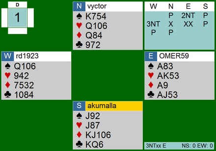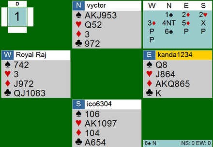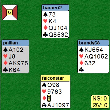er en spiller på BBO jeg har fulgt med interesse i flere år. Han er en notorisk juksemaker og spiller sannsynligvis begge hendene samtidig som han er tilskuer. Dessverre er han nok ikke alene om å drive med fanteri, men jeg håper ingen av dere tillater dere å synke så lavt.. Selv ikke på BBO. Her er et par eksempler fra hans karriære: Han åpnet med sine 10 honnørpoeng og gikk rett i Blackwood når makker hadde vist det samme. Spilleføringen var heller ikke vanskelig. Først toppet han ut spardamen, før han tok for hjerter dame og fortsatte med hjerter til tieren. (ikke esset, damen og så kapp..) Så en "fin" dobling: "Makker" startet med ruter og selv om spillefører gjetta rett i spar, ble det to redobla beit. Jeg vet ikke om jeg skal le eller grine?