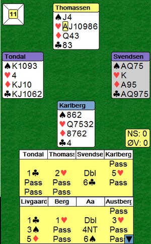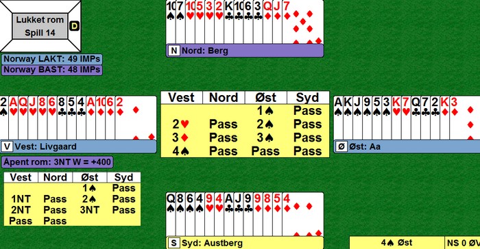 Det var mange interessante hender, hvorpå undertegnede og Ole har funnet ut at man må gjøre noen justeringer på systemet. Det er ofte man dukker opp i situasjoner som gjør ting vanskelig, disse situasjoneene burde man analysere, samt se om det er noe man kan gjøre for å ta tak i dem. Jeg har hele tiden sagt at man ikke må diskutere posser basert på hender, dvs akkurat den hånda man har forran seg osv. Det man derimot kan diskutere/justere er situasjoner som oppstår, dvs når motparten melder inn det eller det, eller når man sitter å spiller et motspill, ikke analyser det ene spillet alene, men diskuter hva de forskjellige kastene skal vise. Igjen på et generellt nivå, ikke HÅND FOR HÅND.