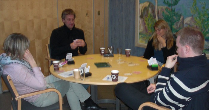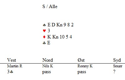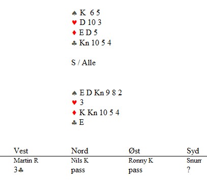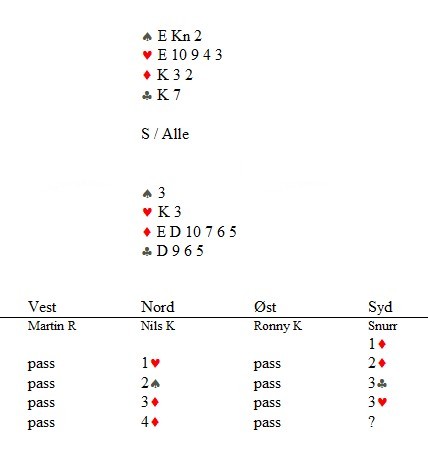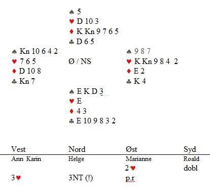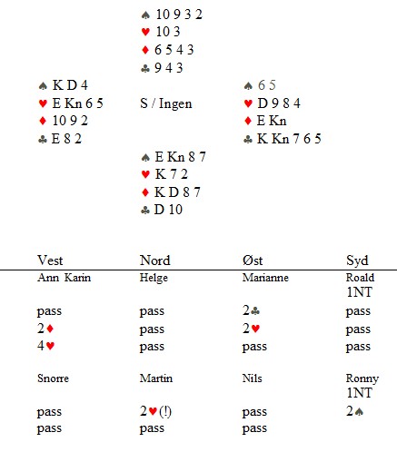 Helge Mæsel passa mer naturlig. 2kl fra Ann Karin viser kløver og en major, mens 2ru søkte tter majorfargen. 4hj var hardt og aktuelt.