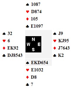Syd (Blanchcard) åpna med 1sp, Geir i vest meldte inn 2kl, nord støtta til 2sp og syd avslutta med 4sp.