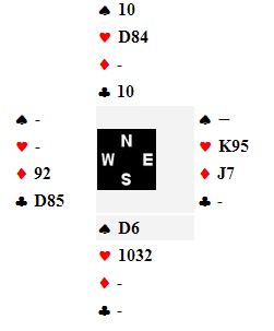 Bordet brukte syveren, Tor knekten og spillefører stakk med esset. Så to ganger trumf, kløver til esset, kløver til stjeling og ruter dame til geir sitt ess. Han kunne fri seg med kløver damen, men se sluttpossen under: