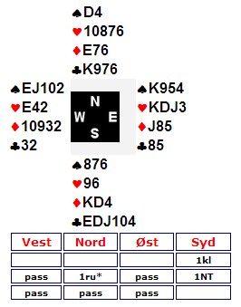 Her er et meldingsforløp fra rett etter krigen. Det ville gitt rein topp i alle norske parturneringer fordi de andre kom i 1NT NS med noen beiter. Øst skulle kanskje vært med i sistehånd, men selv 110 på ØV ville være bra på NS siden standardscoren var 1NT - 5 stikk - 200 ut.