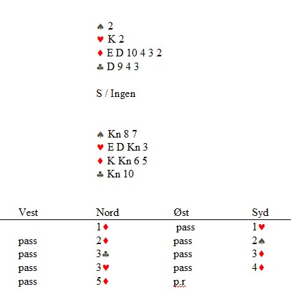 Jeg satt i nord og løftet til 5ru. Det er ingen katastrofe å gå beit i bridge, men min makker i syd bare lo av meg og fortsatte: "En lettere utgang å unngå har jeg nesten ikke sett. Makta du virkelig ikke å se at vi hadde tre tapere? Å komme i 4hj kan jeg ikke skjønne at vi kunne klart, men nå har vi  sladra så mye at motparten kan ikke unngå å beite oss. Det er ikke alle som hadde unngått 3NT på mine kort. Jeg er ikke sinna på deg, Snurr, bare skuffet.."