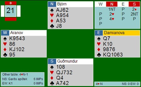 Damianova i øst spilte ut kløverkongen til esset og hjerterdame til konge.  Hun tok for kløverdamen og skifta til hjerter ti. Bordet vant og spillefører kunne gjetta sparen, men det er nesten ikke mulig i praksis.