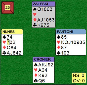 Det første kortet Nunes kasta da syd tok en æresrunde i trumf, var en ruter (!). Med tre kort igjen spilte franskmannen ruter til esset og ruter til nieren.
