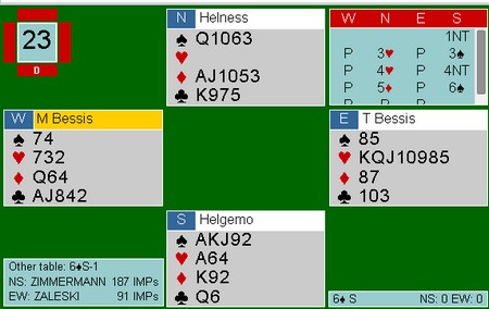 Legg først merke til meldingsforløpet der Tor viser kortfarge i hjerter med 3hj og etterpå sleminteresse med sparstøtte når han følger opp med 4hj. 17hp og fem spar kunne ikke stoppe Geir i syd fra å melde sparslemmen. Vest spiller ut spar til tieren i bordet og kløver til damen for å røyke ut Exx til høyre eller J10x. Damen ble stukket med esset og mer kløver. Under kongen kom tieren og Geir stjal en kløver for å sjekke J10x. Det var det ikke og øst kasta en hjerter.  Så litt fram og tilbake til denne sluttposisjonen: