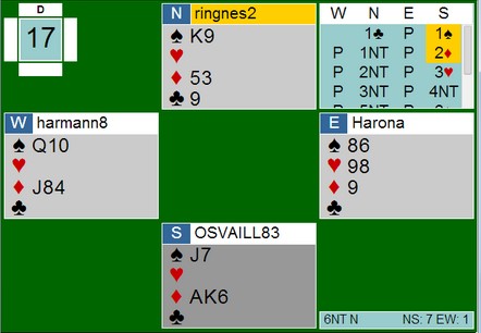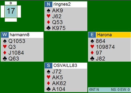 Jeg skal ikke ta med meldingsforløpet, men når nord åpnet var den så mange honnørpoeng i syd at det er vanskelig å stoppe under 6NT. Har du kommet i slem er det i alle fall ingen grunn til å ta sorgene på forhånd, men gyve løs på oppgaven.