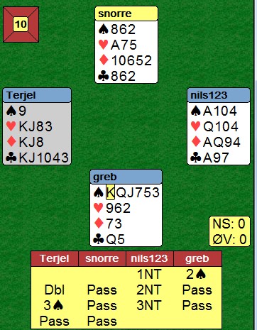 Hadde nord hatt Dxxx i kløver, ville Nils fått Kongens Fortjenestemedalje for denne spilleføringen. Nå fikk han 300 i fleisen i stedet.