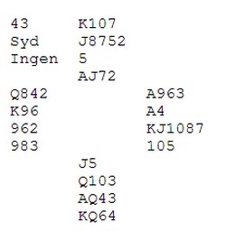 De fleste åpnet med 3ru i nord. Da gikk det pass i øst og 3NT i syd. Vest hadde et rimelig naturlig sparutspill og  ni stikk.