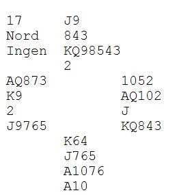 Nå var jeg ovenpå. Hjerter ess og spar til åtter og tier. Mer hjerter til kongen og spar dame (!). Ut med trumfen og ruteress ga motparten det femte stikket. 100 ut ga delt topp.