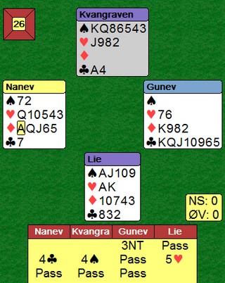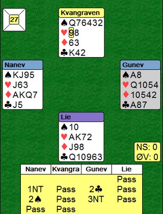 Nils spiller ut hjerter og prøver å treffe makkers farge. Det gjør han forsåvidt, men når Terje legger styrke går 3NT hjem. Han må stikke og skifte kløver.
