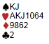 DeButton var også i 4sp, dog etter et litt annerledes meldingsforløp. Syd vrengte kløverkappen ved å spille knekten fra hånda. Hadde damen og tieren bytta plass, ville det vært et spill for galleriet. Nå ble det 10 IMP ut. |