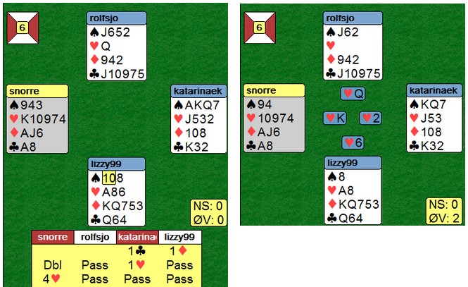 Jeg hadde gleden av å spille lagkamp med dame-juniorlaget og hadde Katharina Ekren som makker. Det jeg likte aller best var evnen hun hadde til å ta stikk. Det er ikke noe en bare kan lære seg, fordi kortfølelse er en underlig teft noen har mer av enn andre. Spar ut til esset og hjerter til kongen. Denne gangen bare et IMP i lagkamp, men det kommer flere av dem i framtiden. Det er jeg rimelig sikker på!!