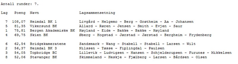 Andre halvrunde starter forsiktig med mange flate spill. I spill 18 levere Allan og Terje et flott motspill mot 3NT og beiter der det blir elleve stikk på det andre bordet. Kampen mellom Heimdal og Vikersund ebber ut uten de store spillene og ender 13.82 - 6.18 til trønderne. BAK ligger på andreplass og de vant nøyaktig med samme sifre.