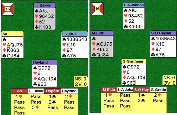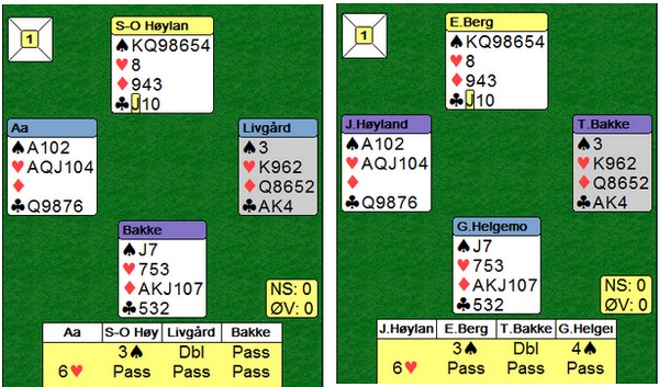 Øyvind Saur fikk sparkongen ut til esset. Han fortsatte med ruter til bordet og kløver til kongen (!). Han tenkte sikkert slik at hvis en var kort i kløver, var det sikkert syd som hoppet til 3sp. Nå kunne ikke 3NT vinnes lenger. På det andre bordet la Glenn Grøtheim ned kløveresset tidlig og da spilte resten seg selv. D10xx kunne fanges opp og en hjerter forsvant på ruteren. Hjerteresset satt foran kongen og +920. Den scoren tror jeg ikke mange slår.