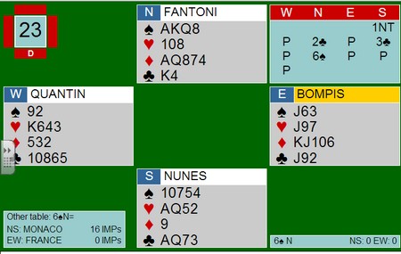 Når det ikke satt kunne Nord stikke knekten og sette opp hjerterfargen. Når sparen nå ikke satt rakk ikke Espen og sette opp et kløverstikk, og måtte derfor gå bet. På det andre bordet spilte spillefører på kløver og hadde ingen problemer med å vinne kontrakten med den fine kløversitsen.