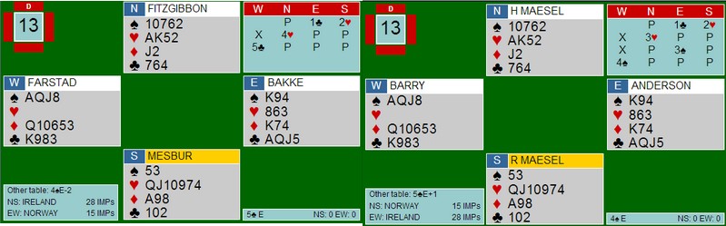 Begge bord stamper fint i 5 ruter over 4 spar. Boye får testet alle farger før han skal treffe hjerter, og spiller fint hjerter til kongen. -300.  Nunes spiller hjerter ved første mulige anledning og håper at Thomas hopper opp på hjerteresset. Men Thomas har tenkt seg godt om i stikk 1 og legger fint liten hjerter. Da bommer Nunes og 5 imp til Norge.