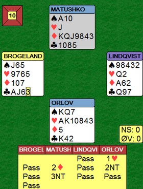 Russeren var heldigvis dårligere (?) enn Terje Lie, så Orlov gikk inn på sparesset og spilte på hjerteren (!) i 3NT. Der er en avhengig av kappen pluss 3-3 sits. I ruter mangler det bare at tieren ikke gir stikk. En heldig utgangssving til Norge siden Boye og Espen fikk tre i kløver, hjerter 9 og ruteresset