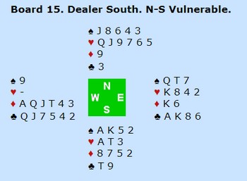 Bjerregård åpnet med 1 kløver og nå gjorde Helge det svært vanskelig for svenskene ved å melde to ruter. Morath i Øst doblet opplysende og Bjerregård meldte sin laveste majorfarge. To hjerter ble passet ut og to sonebet til de kjekke sørlendingene.