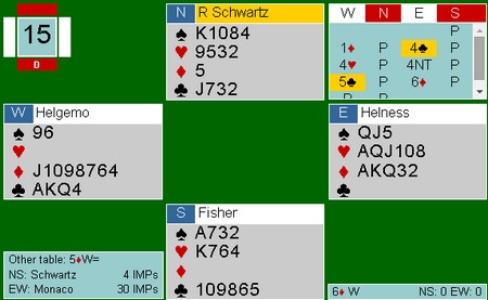 Tor Helness kunne ikke se for seg en hånd der Geir Helgemo ikke hadde en sparhonnør, så han gikk i Blackwood over 4hj. Et ess gjorde han ikke noe klokere, så han bare hoppa til 6ru. Spar ess og hjerterkonge ville vært nok til 7ru, mens den hånda Geir hadde kunne endt med beit. Ron Scwartz i nord spilte ut hjerter og da endte det kjapt med tretten stikk.