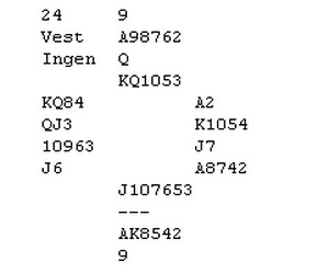 og Sverige vant 10 IMP mot Norge i denne slemmen siden Norge på det andre bordet stoppet i 3NT. En sving på 20 IMP for å finne hjerterdamen.