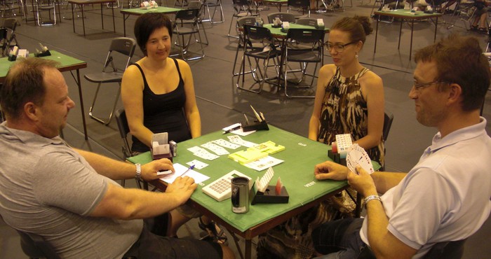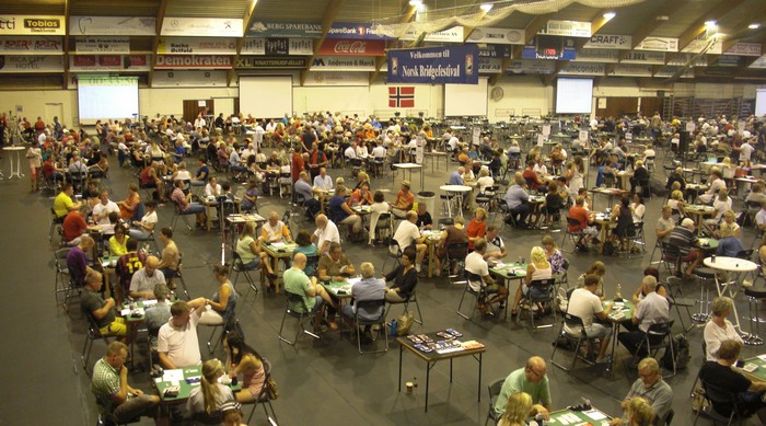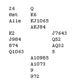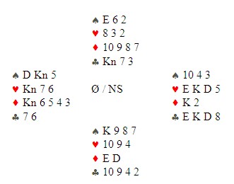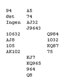 Åse Biribakken i vest starter med 1ru, Geir "kaninen" Brekka i nord dobler opplysende, Helge Mæsel viser sparen sin og vest avslutter meldingsforløpet med 1NT