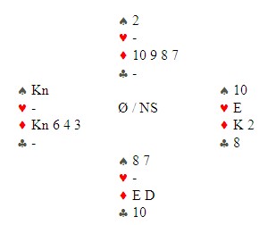 Så mer spar til Geir sitt ess og han frir seg med hjerter dame (!). Bordet vinner med kongen og kan ta to sparstikk til. Når det spilles ruter, fræser Åse Langeland opp på esset, tar for den trettende kløveren og spiller hjerter til Geir. En beit !!