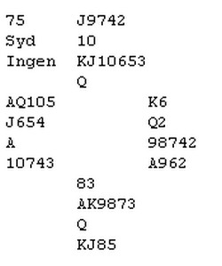 GEO må våge å ta tak i slemstatistikken til det norske parene, Kvangraven - Lie noe, men spesielt Hoftaniska - Charlsen. De siste hadde misforståelser over en lav sko og selv om de gjetta rett enkelte ganger, var det i mine øyne mer bingo enn bridge til tider. Gambling og gjetting med dårlige odds er noe som hører hjemme i Casino, ikke ved bridgebordet. Hoffa og Thomas har meldt i BIN de siste månedene, og selv om paret sier at de ikke var maks forberedt og heller ikke uthvilte da de meldte, viser det seg gang på gang at det hjemmesnekra systemet deres har store huller. Det er ikke bare å tro at en kan finne på nye konvensjoner som skal slå etablerte "sannheter" når det gjelder meldesystemer. Det er fint å vite om kortfarger, men paret brenner seg flere ganger på at de vet ikke nok om verken honnørstyrke eller antall trumf de har tilsammen. Her har du etter min mening en jobb å gjøre, GEO!
