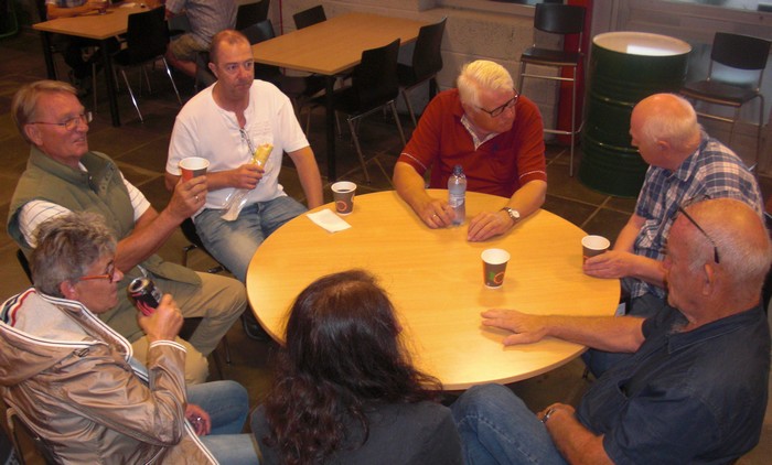 I kantina møter jeg en gjenge som sitter og venter på sluttspillet i par.