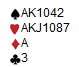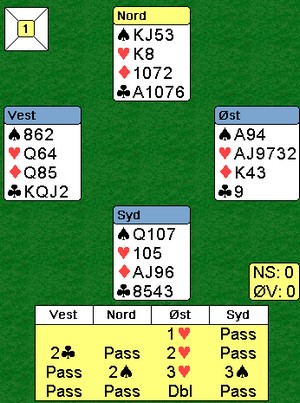 Vest kommer seg ikke ut av ruteren og må avslutte med hjerter opp i EJ eller et kort til dobbeltrenons.