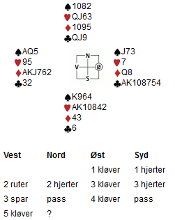 Meldingsforlaupet var det same på båe bord, 1 grand i sør og 3 grand i nord, pass rundt. På båe bord spela vest kløver dame ut til dukk, ny kløver til esset i sør, før ein spar gjekk til dama og kongen. Ny kløver gjekk så til kongen, og der vart vegane skilde. No må eg vel seia at polakken Tuczynskijs føring vekkjer sympati, spar til tiaren og ruter opp mot dama. Førebels veit ein berre at vest har lengda i kløver, så slik sett kunne han fort ha hatt ruter ess dobbel. No vann Harald Eide i aust med esset og spela spar knekt attende til esset, og Tuczynskij vona ruteren sat 3-3 då han spela ruter og meir ruter. Men Ellingsen hadde no beita i minor, som vel å merkje skviste Eide i major slik at det berre vart éi beit, ei fattig trøyst for polakken, som nok såg at han kunne vunne kontrakten. Inne i bordet på kløver konge spela Kristoffer Hegge meir aktuelt, då han drog ruter til kongen og deretter dukka ut ruter ess. Aust kom inn og spela spar attende til tiaren, og no hadde nordmannen plutseleg full kontroll her: Ruter til dama stadfeste det han allereie visste om rutersitsen, deretter ein spar til esset, og då fargen ikkje sat var det berre å ta hjarter konge og spela aust inn i spar. Som venta hadde han ikkje anna enn hjarter att å spela, opp i ess, knekt for 400 blanke.