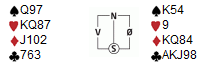 Syd åpner meldingene med en ordinær svake 2-åpning: Normalt 6korts og 7-10p. Det går pass til makkeren din i øst, og denne velger å melde 3kløver. I siste hånd trenger ikke 3 kløver å være så sterk, men ettersom du har litt kløverstøtte velger du i vest å klemme til med 3NT. Makker har gode kort og er tilfreds. Med svakere kort slår han av med 4 kløver.