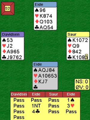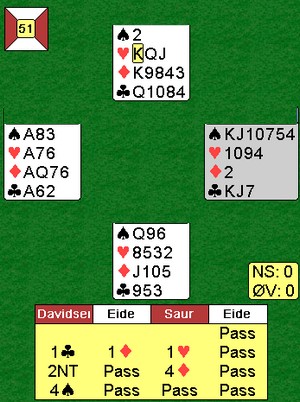 De fleste kom i 4hj i nord, men minst en spilte kontrakten fra syd og fikk kløver ut fra vest rett opp i ED. Det forsvant to ruter og elleve var sikret.