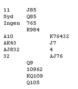 Jeg skrev at Kolbotn BK har 1 lag mindre enn i fjor. Einar og Gerd vil spille på et Ås lag i år, og at det er et sammarbeidende lag mellom Nesodden og Kolbotn BK. For Ås 1 spilte denne gang Einar Knutsen og Bård Lian. De spiller i C-pulja og gjorde sine saker bra. De vant over Spydeberg 1 med klare siffre (15,14 - 4,86) og har fortsatt med en god første halvrunde mot Vestby2 og leder med 9 IMP. Samarbeidlaget mellom Nesodden og Kolbotn (NESBOTN) stilte denne gang med 4 spillere fra Kolbotn (Marit Hjerkinn, Trond Østlie, Egil Finstad og Leif Theodorsen). Det slo Hjertedamene 14,58 - 5,42) , men har kommet langt bakpå mot Vestby BK3.