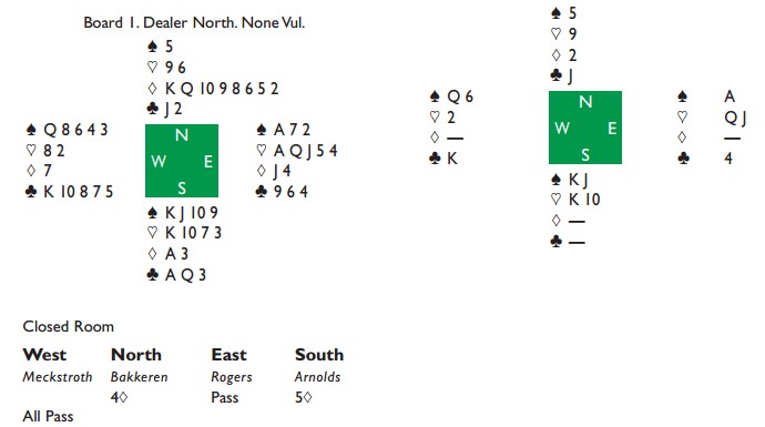 Øst hadde et vanskelig utspill og startet med hjerteress. Så skifta han til kløver, men spillefører gikk opp på esset og tok syv ganger ruter. Før den siste er posisjonen som oppe til høyre. Øst kan ikke kaste majorkort, så da må kløveren gå. I bordet forsvinner hjerter ti og så spar fra hånda. Pent!!!