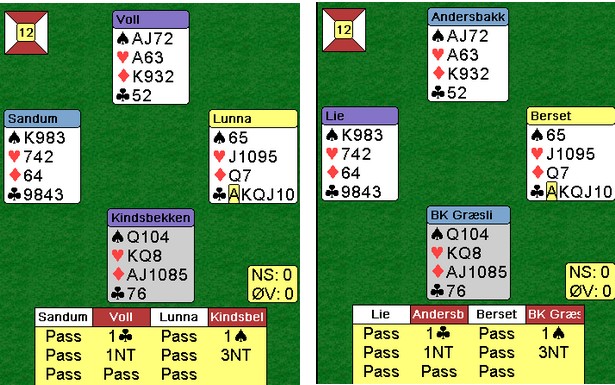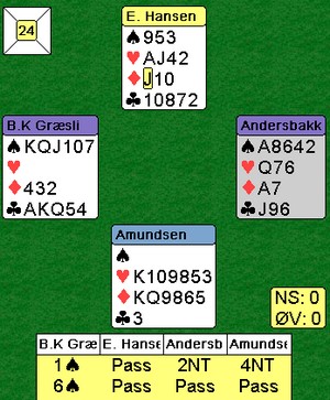 Her spilte Alf Andersen fint mot lederne av Rondacupen - Lag. Det kom kløver ess ut og skift til trumf. Den stakk han i bordet (syd) og spilte mer kløver til dame og konge. Kløver knekten ble trumfet og trumfen tatt ut i to runder. EK i ruter og ruter mot knekten i posisjonen til høyre. Øst måtte stikke og hadde bare spar igjen. Det som var litt trist for nord, var at han hadde hørt øst melde inn 1sp i sonen. Derfor mente han det var mest sannsynlig at han hadde kongen og gikk derfor i med bordets dame. Ei beit, til tross for alt strevet.